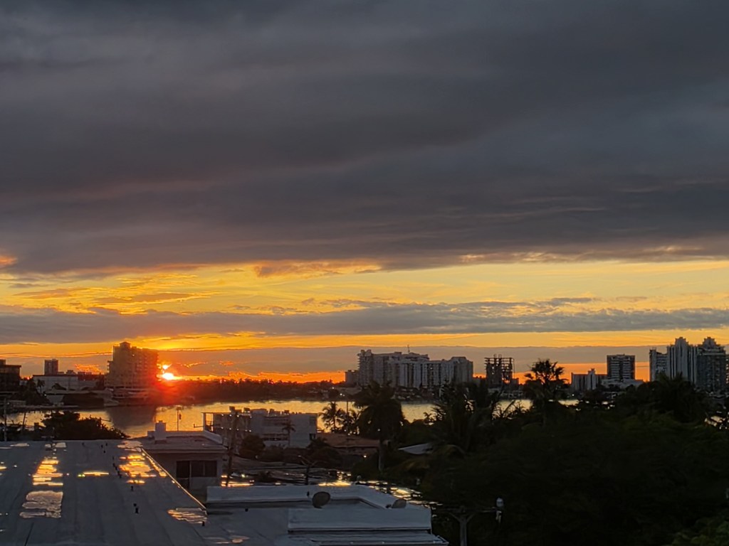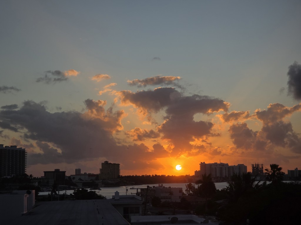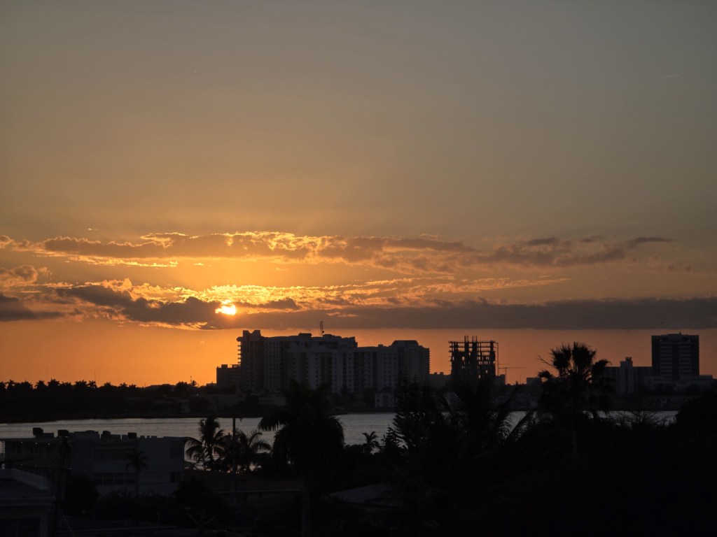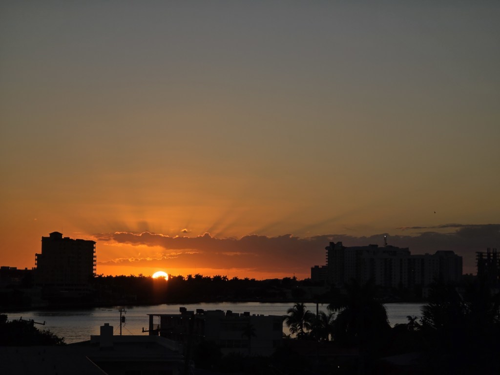 Here the sun is setting just to the right of that building.The sun is moving even further to the right.Here it is even further to the right.It looks like it is going to hit those buildings. Last night the sun lit up that building to the far right that is still under construction.