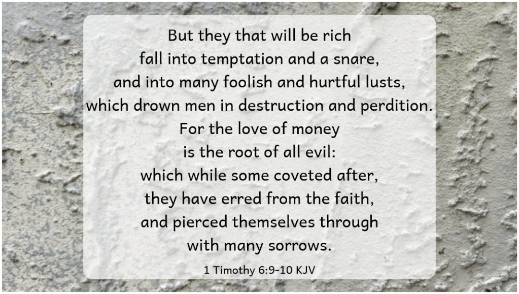 1 Timothy 6:9-10 Linda G. Hill’s One Liner Wednesday. Badge by Laura @ riddlefromthemiddle.com Like Loading... Related Author: Frank Hubeny I enjoy walking, poetry and short prose as well as taking pictures with my phone. View all posts by Frank Hubeny